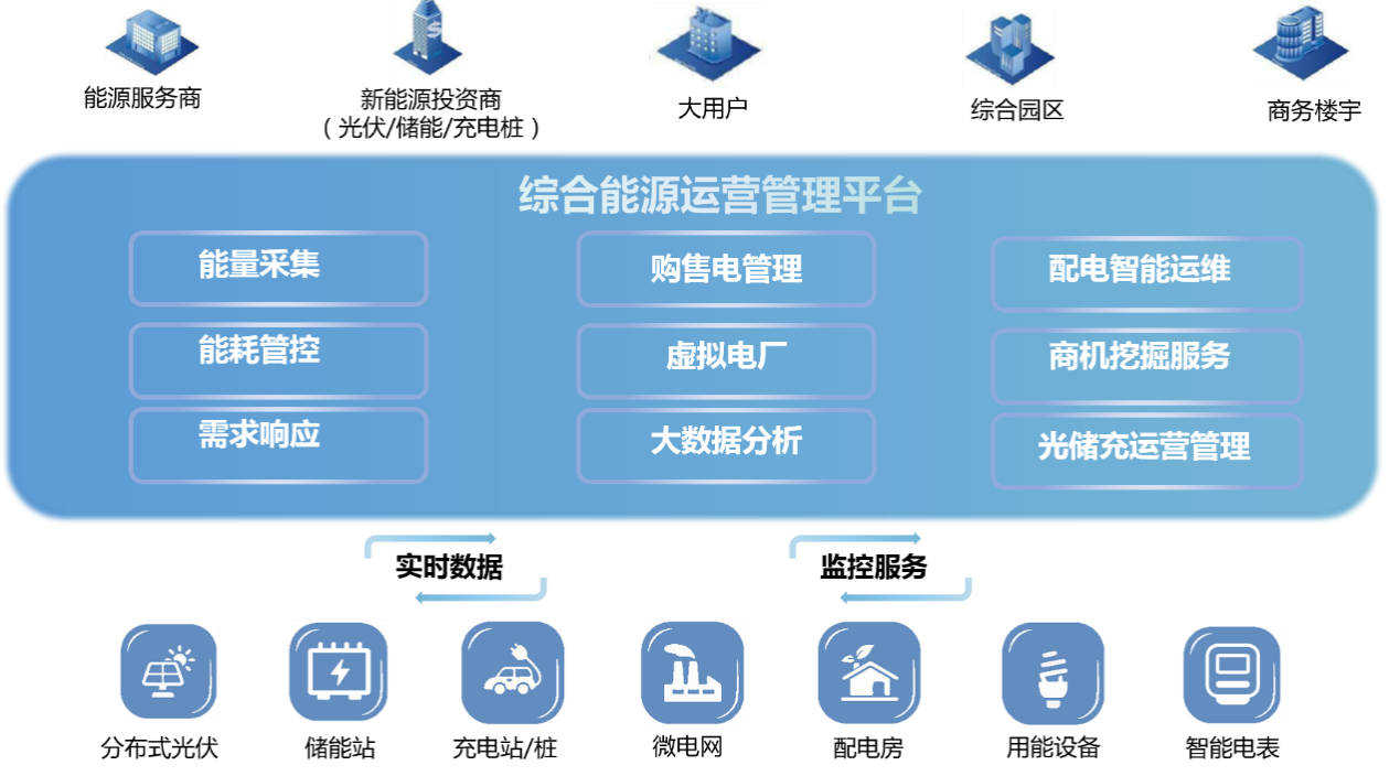 ×ÛºÏÄÜÔ´ÔËÓªÖÎÀíÆ½Ì¨Ô̺¬ÄÜÁ¿Êý¾Ý²É¼¯¡¢¹ºÊÛµçÒ»Ì廯ÖÎÀí¡¢ÅäµçÖÇÄÜÔËά¡¢¹â´¢³äÔËÓªÖÎÀí¡¢Ðé¹¹µç³§¡¢ÐèÒªÏìÓ¦¡¢ÄܺĹܿء¢´óÊý¾Ý·ÖÎö¡¢ÉÌ»úÍÚ¾ò¡¢ÏîÄ¿ÖÎÀíµÈ·þÎñ, Âú×ã·ÖÆçÀàÐÍÄÜÔ´·þÎñÉ̵ÄÒµÎñÐèÒª£¬ÎªÄÜÔ´·þÎñÉÌÌṩȫ·½Î»¿É³ÖÐø·¢Õ¹µÄ×ÛºÏÄÜÔ´ÔËÓªÖÎÀíÆ½Ì¨£¬´òÔì¶à·½¹²Ó®µÄóÒ×ģʽ£¬ÌáÉýÄÜÔ´·þÎñÉ̵ķþÎñÄÜÁ¦ºÍÓ¯ÀûÄÜÁ¦£¬¼Ó¿ìÄÜÔ´Óû§ÂÌÉ«µÍ̼תÐÍ´ëÊ©£¬ºÏÁ¦Íƽø“˫̼”Ö¸±êÔçÈÕʵÏÖ¡£